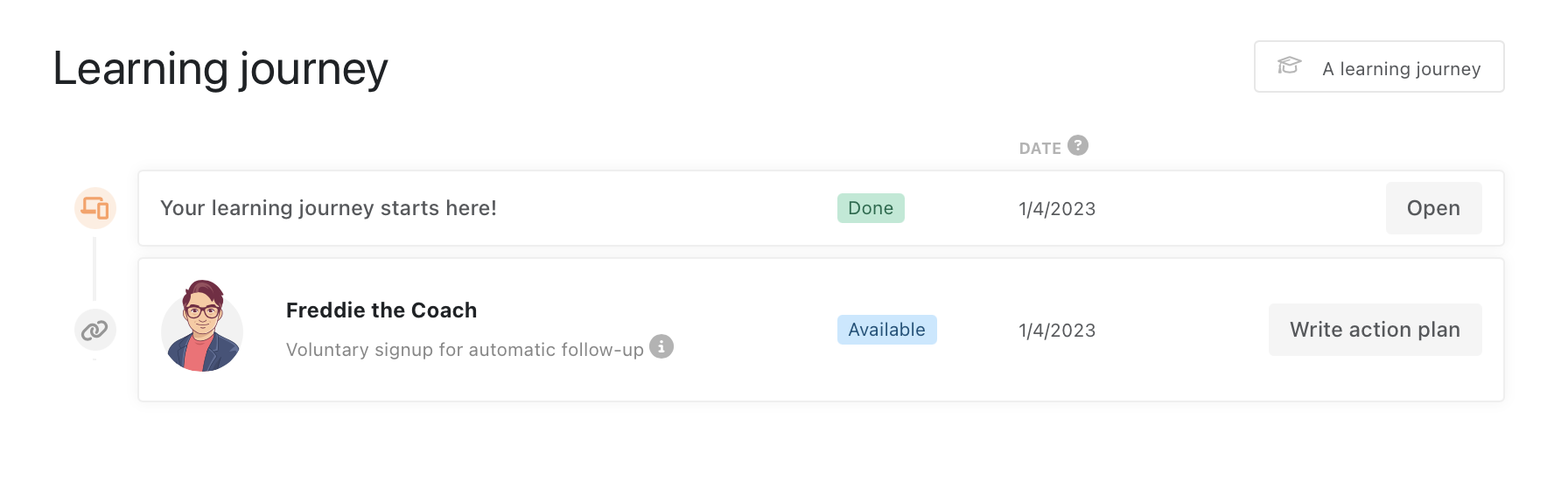 If Freddie, the digital coach, is a part of the learning journey, I will be able to see Freddie in the timeline. If Freddie is open to registration, I can register right there; if not, I can read up on the concept of Freddie the Coach.