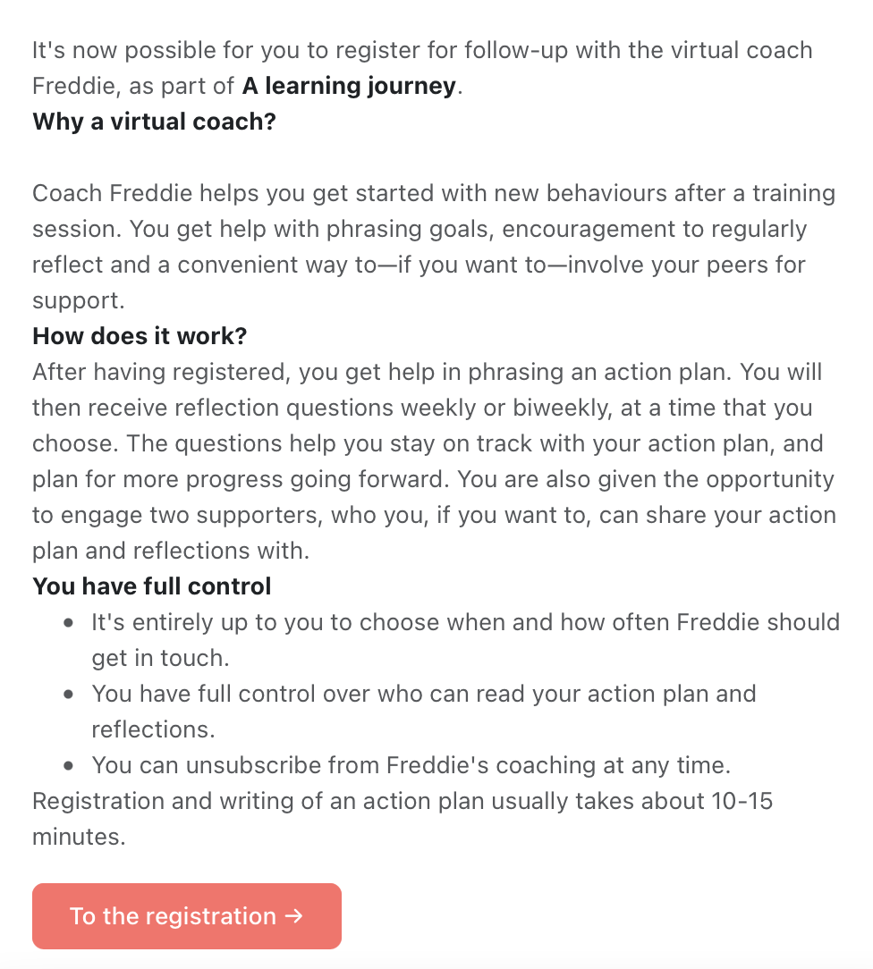 As the one administrating the journey, it's up to you when participants should be able to start registering for Freddie's automatic coaching. If the registration has yet to open, participants can still see Freddie in the timeline and read more about how the concept works but not actually register.