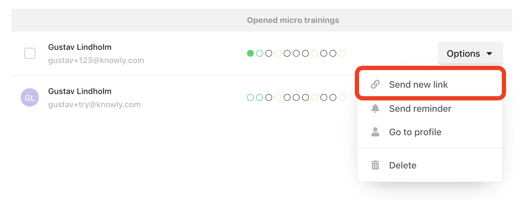 It happens that you lose an email or SMS in your inbox, and it is both time-consuming and frustrating to look for all the links and mailings that you need as a participant. In Knowly, we have taken this common behaviour into account and made it possible for you, as an educator/administrator, to resend the link.