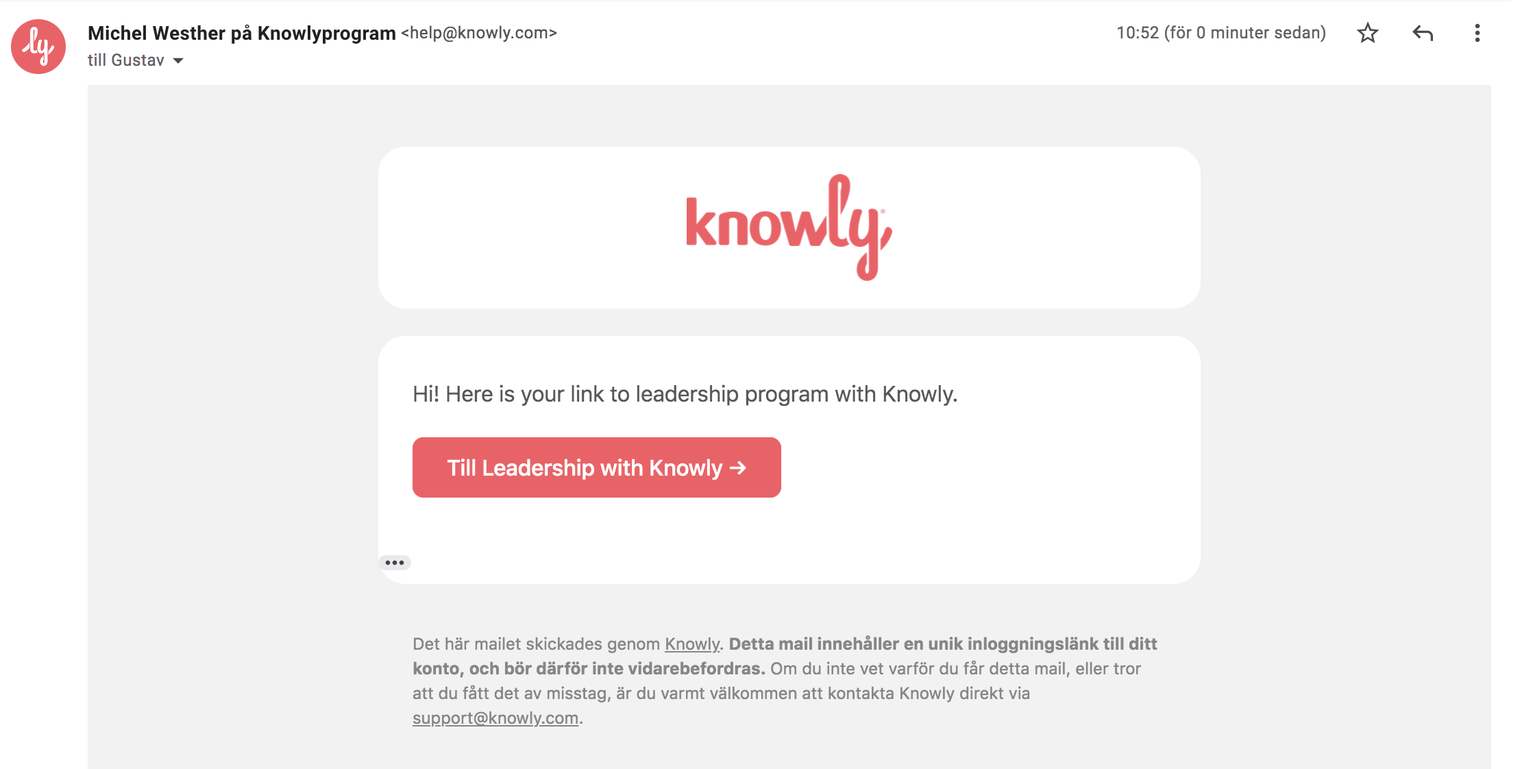 - In the next step, you can choose whether you want to send a link to the overview of the entire learning journey or whether it is to a specific mailing that you want to refer the participant to. Depending on what contact information you have on the participant, you can choose the delivery method email/sms. Then change the sender and add text to your message, for example, "Hi Gustav, here is a new link to the Leadership Program with Knowly", and press send.