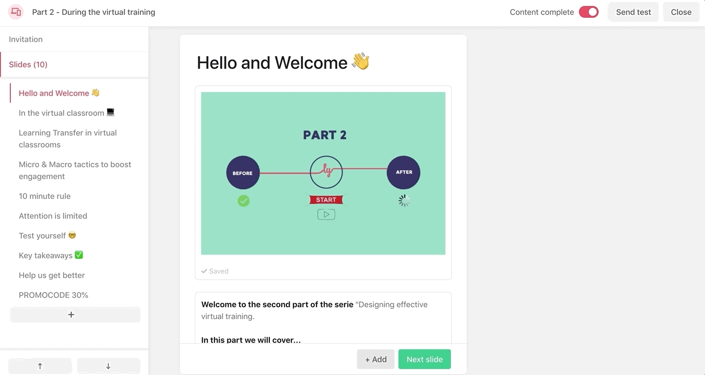 A micro-training is the digital training material you, as an administrator, create for the participants. A micro-training consists of slides where you can add elements such as texts, pictures, videos, questions, Flashcards and files.