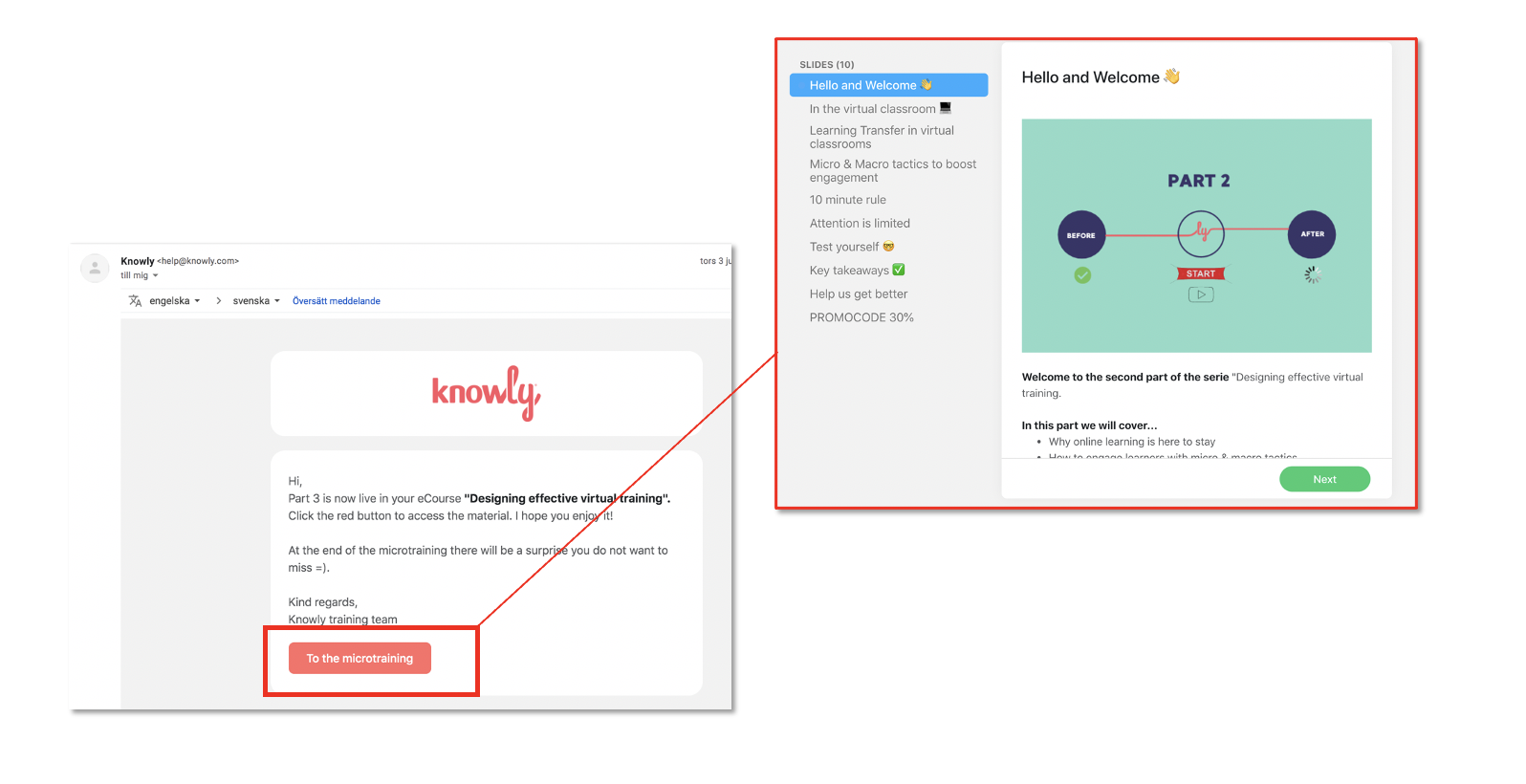 The material the administrator creates in a micro-training is then scheduled to the participant group and sent out as a link. Either as an SMS or via email, depending on the choice of delivery method. The participant clicks on the link, and the micro-training opens up in the browser (it works just as well on the phone as the computer).