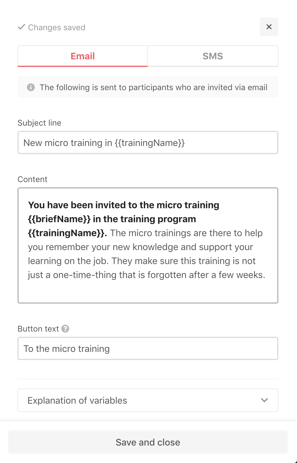 You can edit texts in the invitations sent to participants via email and SMS. This feature allows you to create more personal and specific mailings to participants. The invitation is the text the participant receives in an email or text message with the link to micro training included.