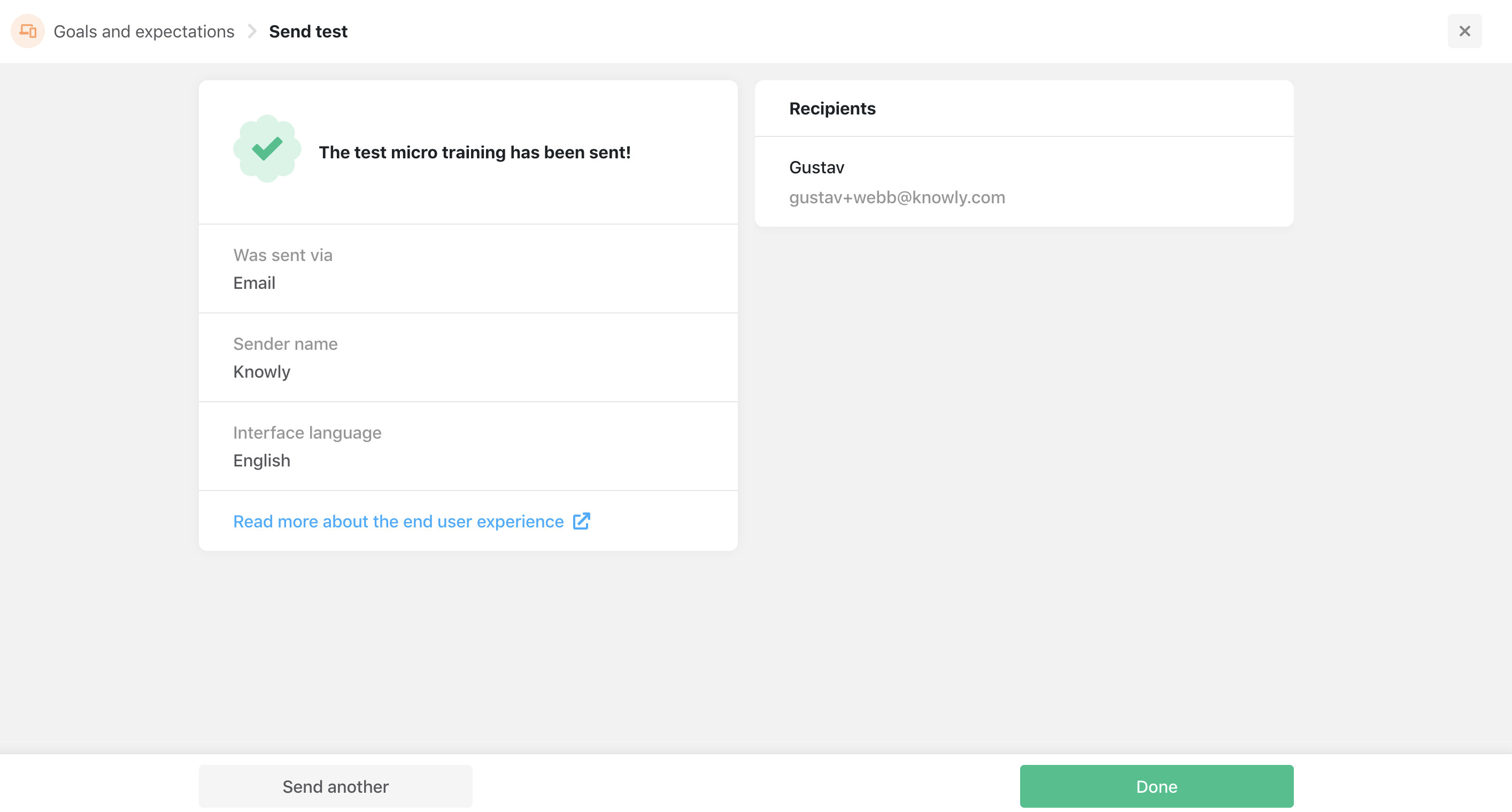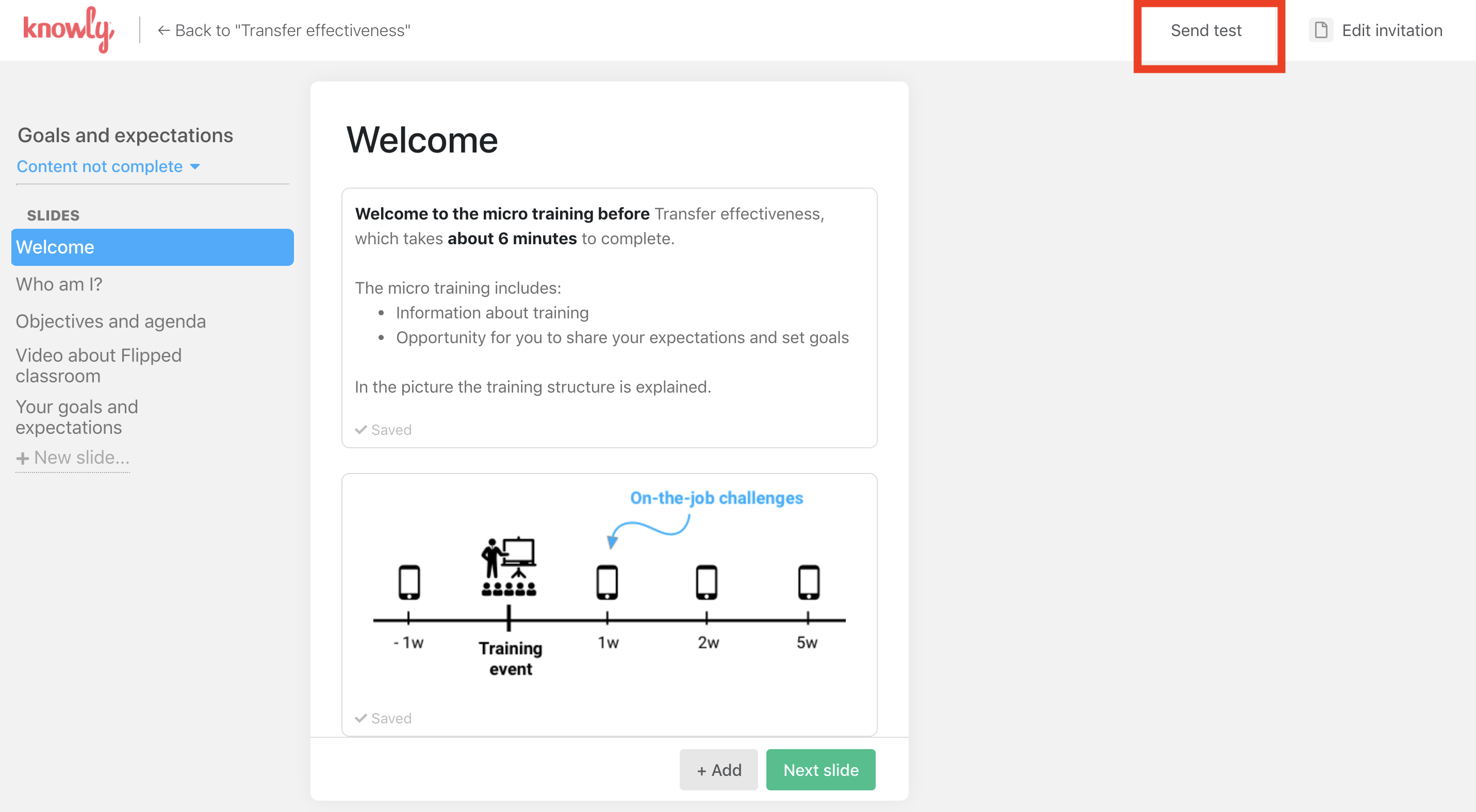 To use the "Send test", you start by going into the micro training you want to see. Once inside the micro training, click on "Send test" in the upper right corner:
