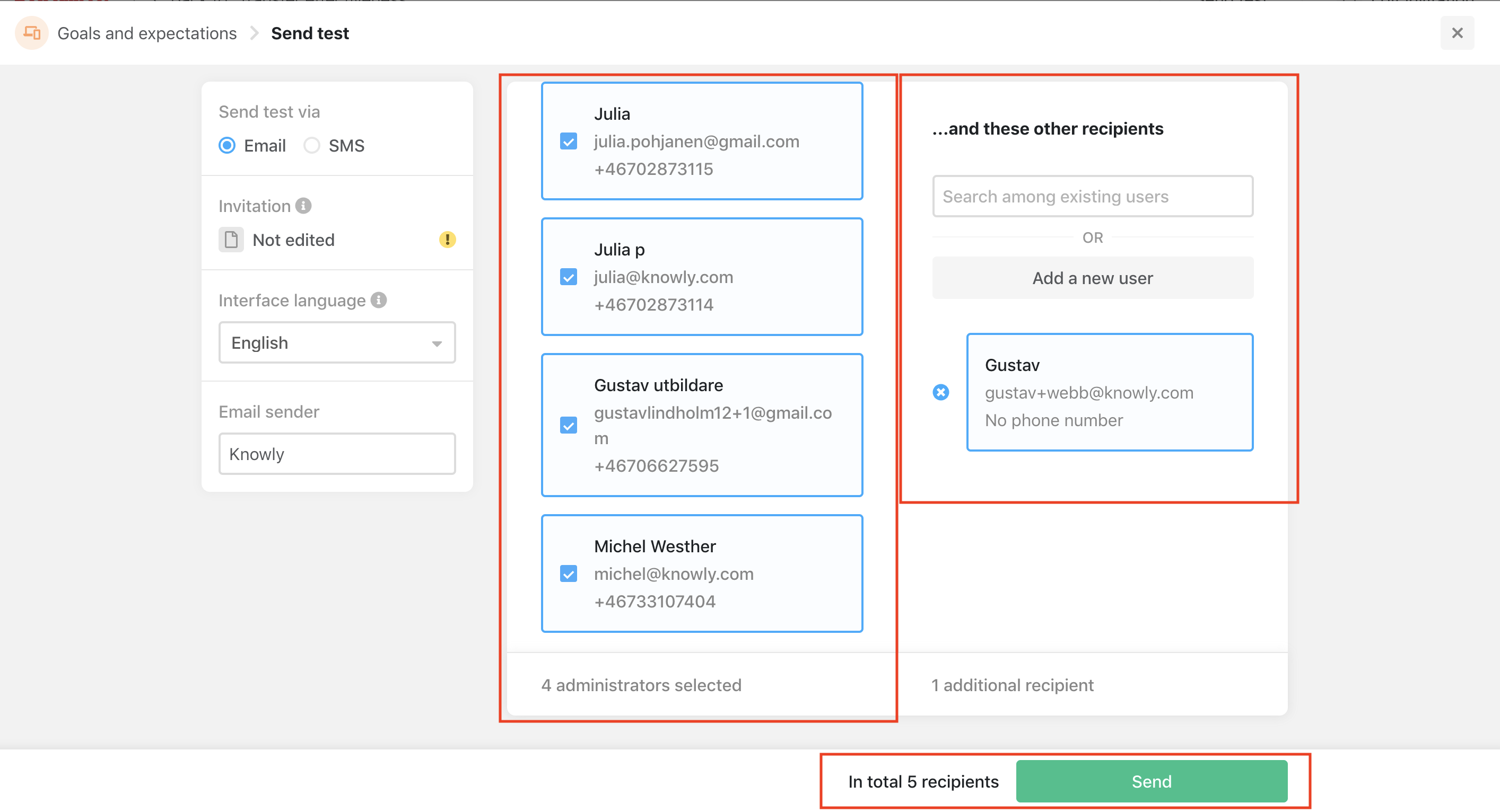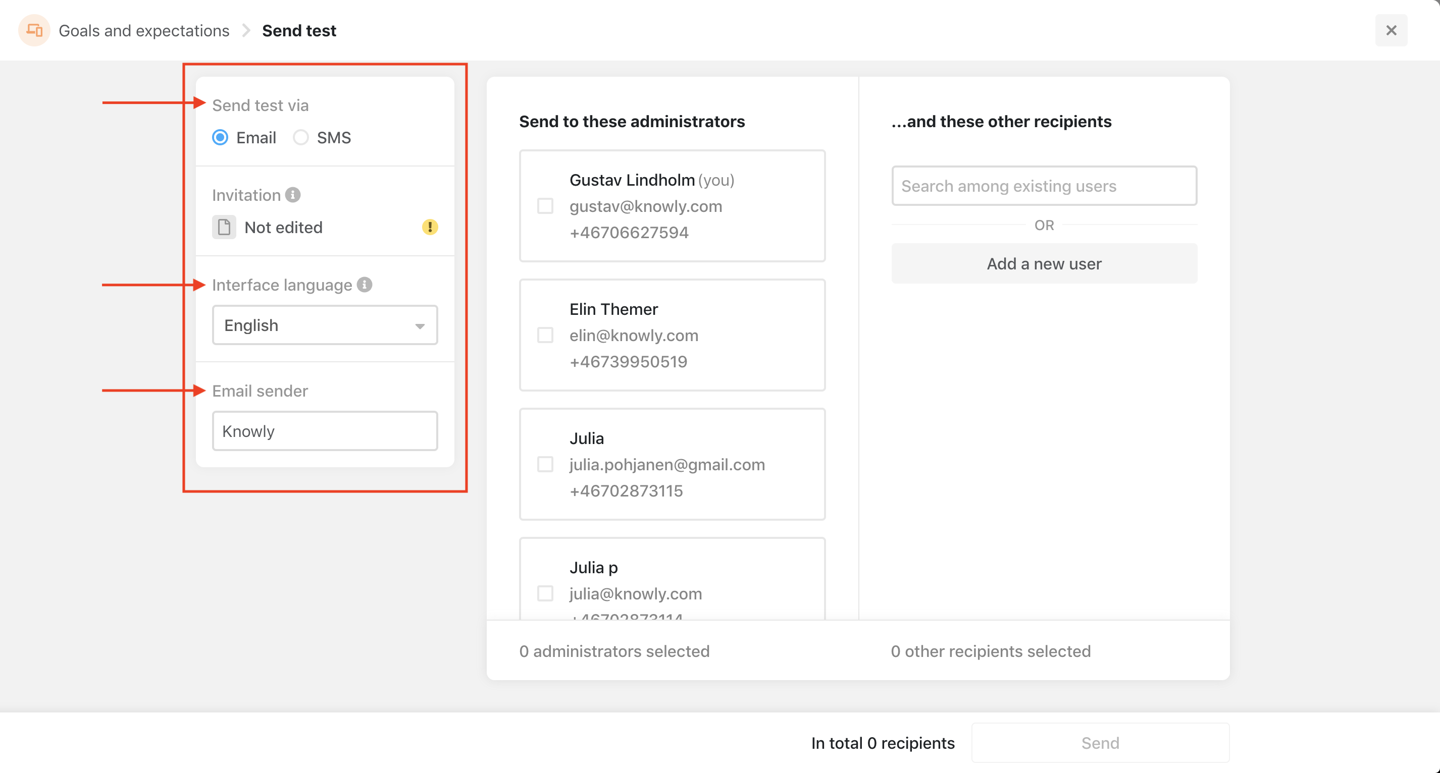 Then it's time to choose a recipient. To the left is a list of administrators and trainers in your organization, which you can quickly choose from. If you want to send it to someone who is not an administrator, you can search among existing users or add a new user in the field next to it.